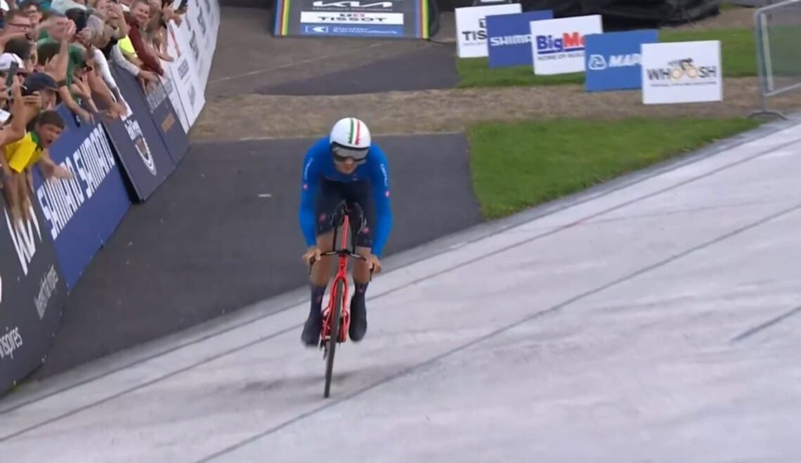 There was the whiff of panic in the start house for Remco Evenepoel at the UCI Road World Championships in Zürich on Sunday, but the Belgian successfully defended his time trial rainbow jersey. He adds the 2024 chrono title to his Paris Olympic Games time trial gold medal. Filippo Ganna and Edoardo Affini gave Italy two chaps on the podium. Evenepoel’s feat of Olympic Games and Worlds titles parallels that of Grace Brown’s. Canadian Pier-André Côté was on the hot seat with 56:00 early in the day and placed 19th.