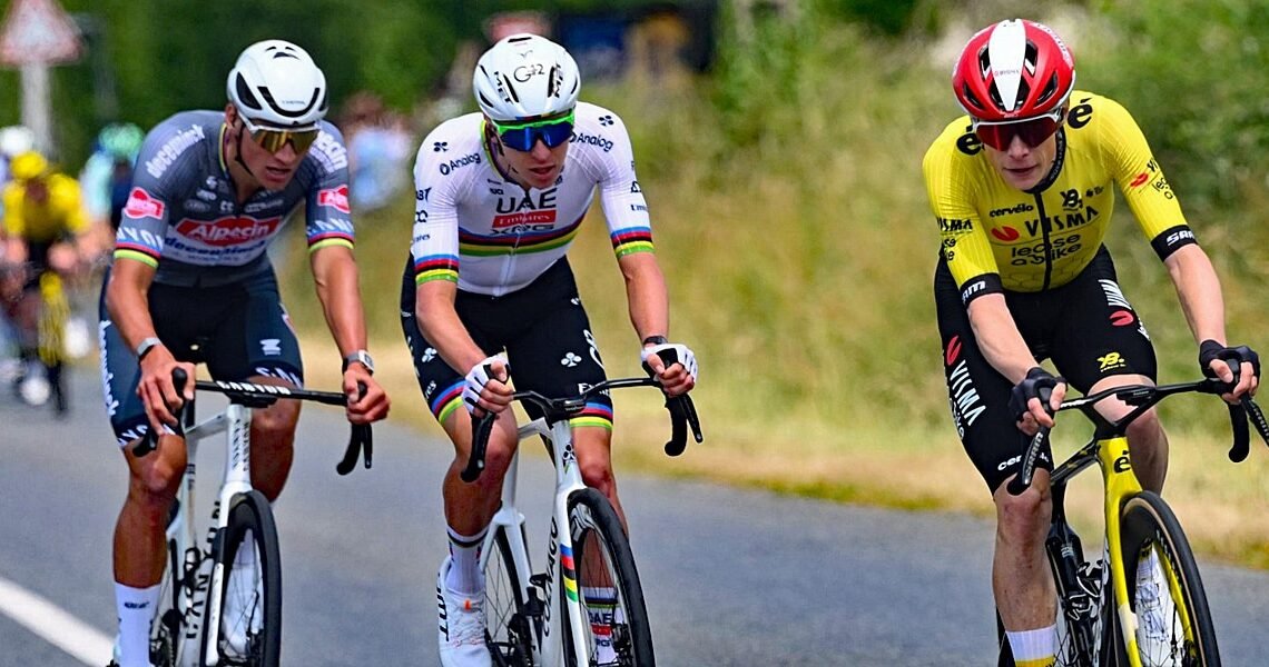 Stage 1 of the Critérium du Dauphiné already delivered a thrilling chapter into the royal rumble anticipated this week with the likes of Tadej Pogačar, Jonas Vingegaard, Remco Evenepoel and Mathieu van der Poel battling it out. The four superstars took the first four positions in Montluçon after a thrilling finale. Vingegaard put the hammer down with just over 5 kilometres to go and his three major rivals followed his move, alongside Santiago Buitrago. The Colombian climber was swallowed by the bunch in the sprint but the other four managed to get the better of the field, with Pogačar flying past Van der Poel with only 25 metres to go. Vingegaard finished 2nd in between the winner of the Tour of Flanders and the conqueror of Paris-Roubaix. Five years after his first participation, Pogačar takes his first stage win in the Dauphiné, and his tenth success as the reigning UCI World Champion.