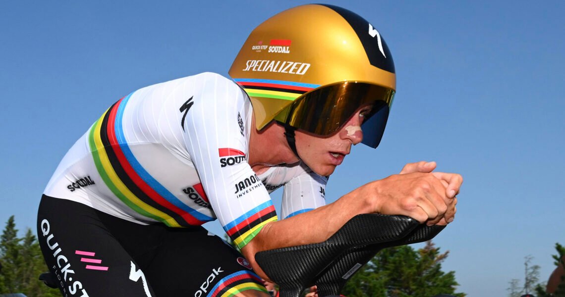 Domen Novak (UAE Emirates-XRG) was the first rider off the ramp, at 14:15. His time at the finish (24:43) was quickly beaten by Norwegian national champion Soren Waerenskjold (Uno-X Mobility), setting a reference of exactly 23 minutes. It takes a major effort from his countryman Tobias Foss (INEOS Grenadiers) to edge him from the hot seat. Remco Evenpoel’s predecessor, crowned ITT world champion in 2022, clocks a time of 22:00 (47.4 km/h). Foss’ time resists until Rémi Cavagna (Groupama-FDJ) reminds everyone why he’s known as the “TGV from Clermont-Ferrand” (“high speed train”). After 10.5km, the French specialist is 17 seconds ahead of Foss. At the finish, he maintains a gap of 3 seconds, with an average speed of 47.6 km/h. The “Clermont-Ferrand TGV” enjoyed half an hour in the hot seat, but was knocked off the top spot by Matteo Jorgenson (Visma-Lease a Bike), who raised the bar even higher by improving the time to beat by 28 seconds.