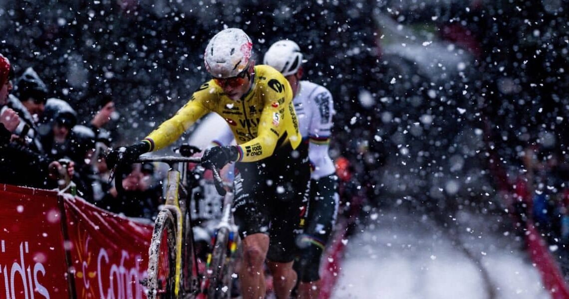 Van Aert, who has mostly appeared shaky in this season’s cross races, seemed to have gained confidence and technical solidity after losing the race lead briefly in a challenging sand section. He was riding capably with van der Poel, even seizing the lead for stretches; as the two traded punches, heavily falling snow made for a vivid ‘cross scene.