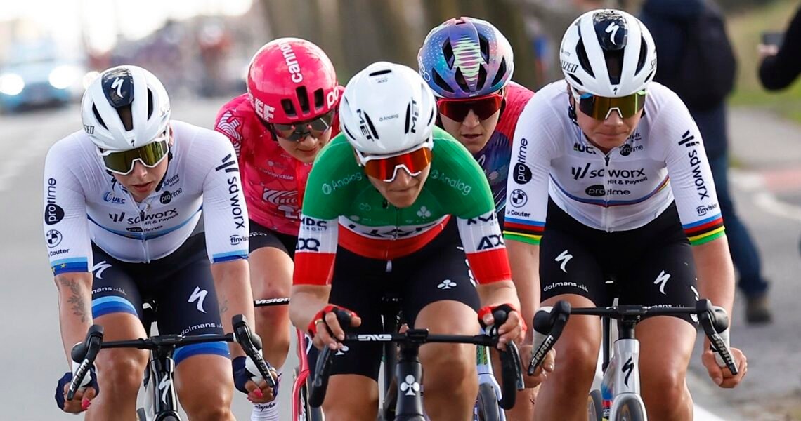On the last passage over the Kemmelberg, it was World champion Kopecky who pushed hard. Only her teammate Wiebes, Longo Borghini and Elise Chabbey (FDJ-SUEZ) were able to hold her wheel. After the descent, Chloé Dygert, Giada Borghesi and Letizia Borghesi also joined them, while Chabbey had dropped back to the chasing peloton.