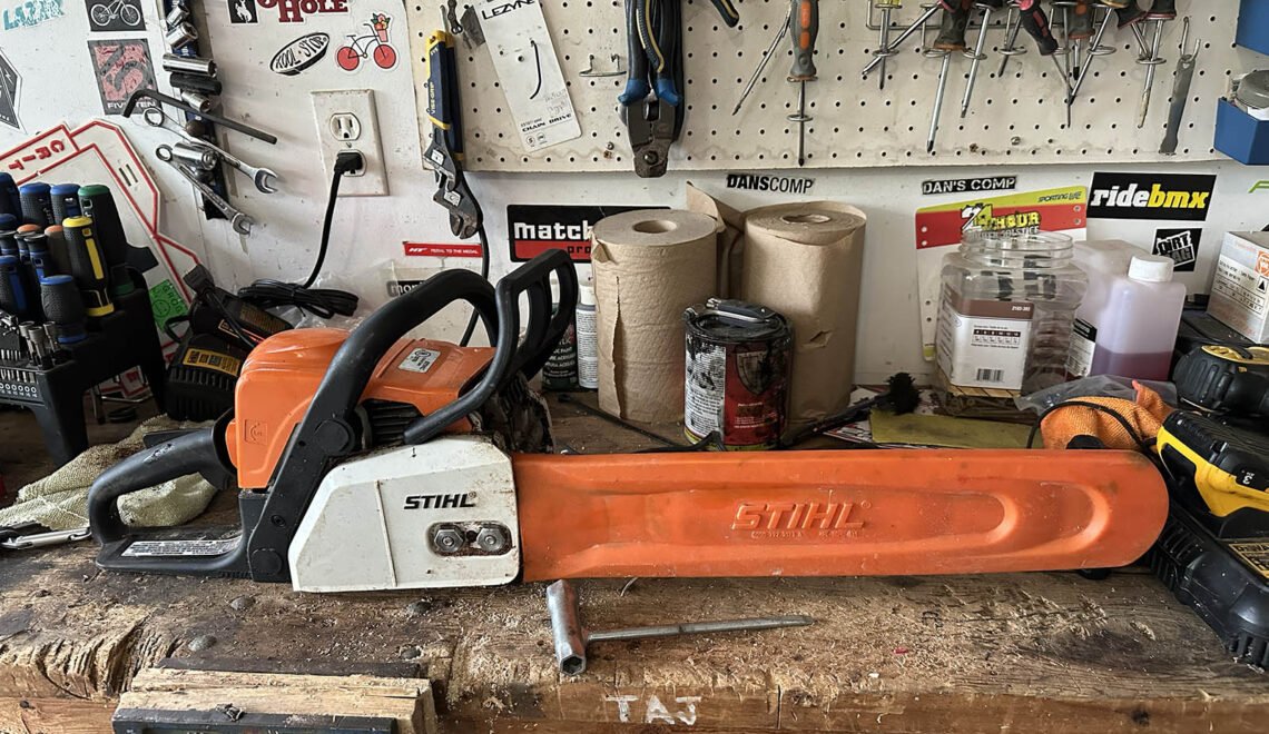 Keeping both the bar oil and the mixed fuel reservoirs topped up is key to a dependable chainsaw. But if you’ve got no bar on the tool, do you need bar oil? “Nah it’ll just puke oil all over the place,” says Due North Custom Carpentry’s Adam Burk. “No bar means no bar oil.” Obvious, but now you know for sure. If you can figure a good way to drain the bar oil reservoir let us know.