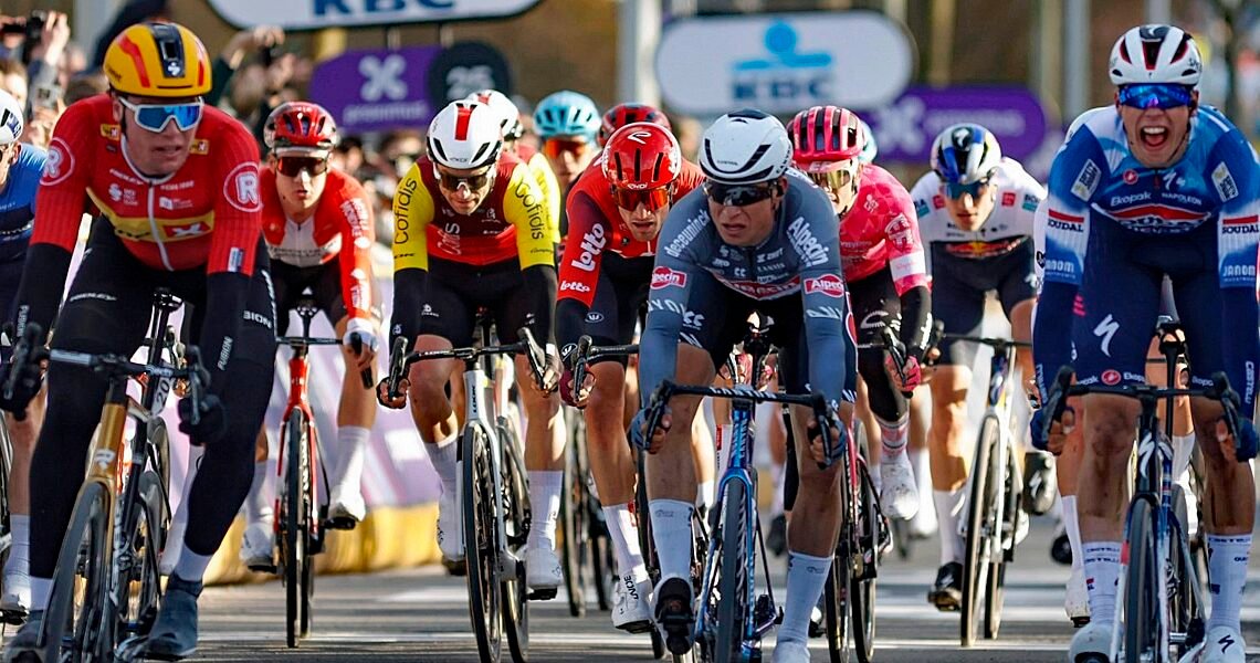 Race Report: The first ‘real’ race of the season, the Omloop Het Nieuwblad, surprisingly finished with a bunch sprint and in a close fought lunge for the line, it was Uno-X Mobility’s Søren Wærenskjold who got the better of Paul Magnier (Soudal Quick-Step) and Jasper Philipsen (Alpecin-Deceuninck).