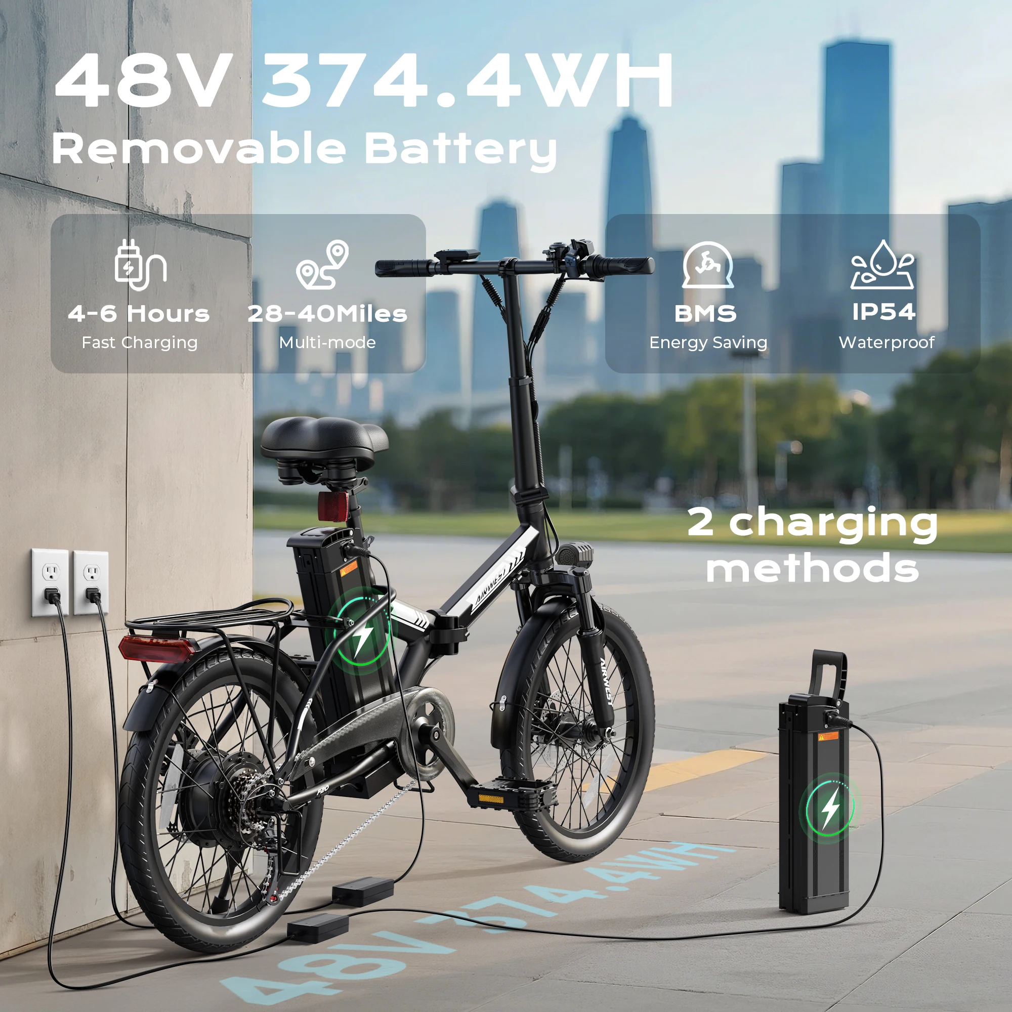 Adult Electric Bike, 750W Peak Motor, 48V 7.8Ah Battery, 20-Inch City E-Bike, 20 MPH, UL 2849 Certified, 1-Year Warranty