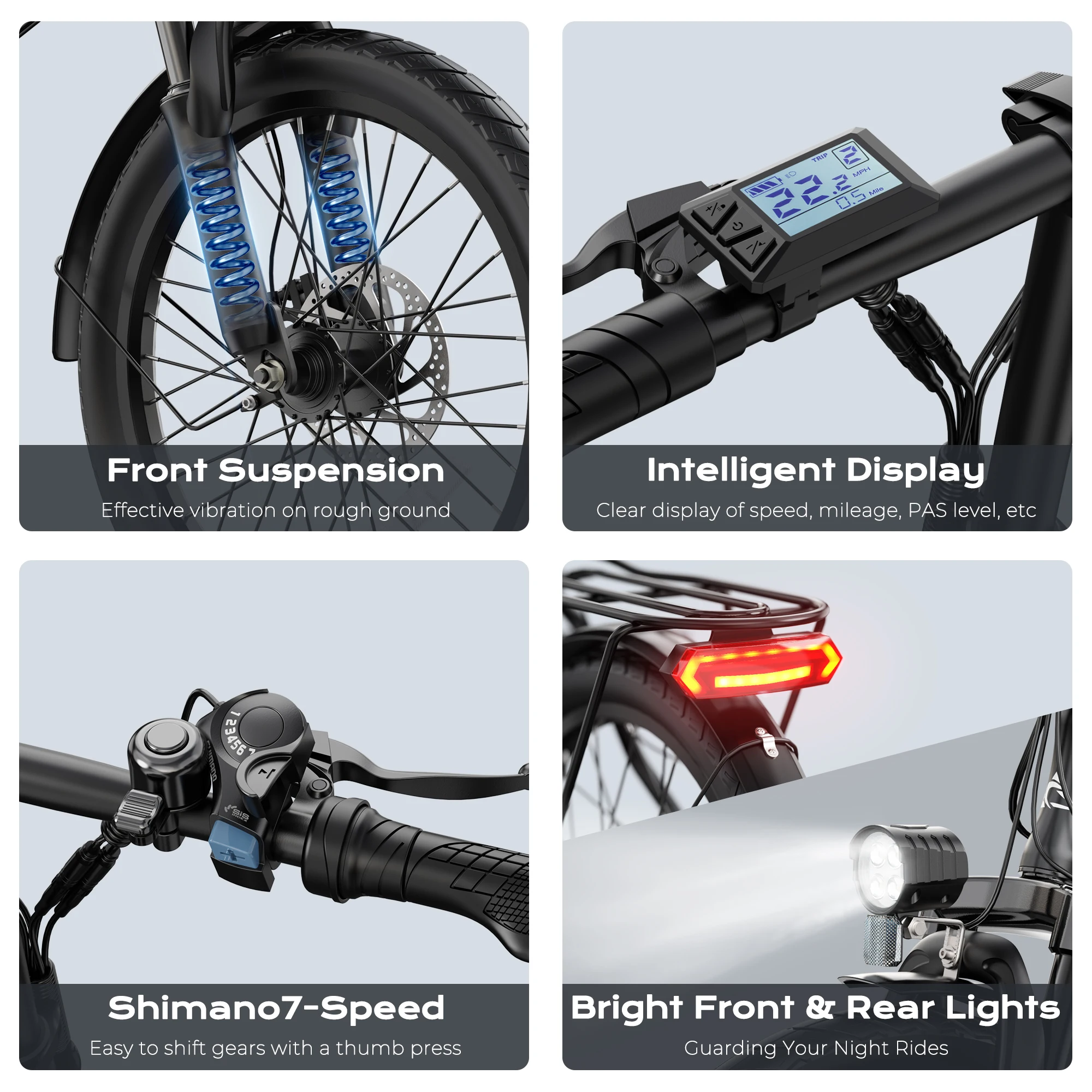 The AIRWEST F20 is built for riders who want a balanced combination of power, comfort, and convenience. Its brushless motor delivers efficient support when you need it most, while the 7-speed Shimano drivetrain gives you the flexibility to adjust your pedaling effort based on road conditions and riding style. The compact 20-inch wheel size improves maneuverability, making this e-bike especially well-suited for city streets, bike lanes, and tight spaces.