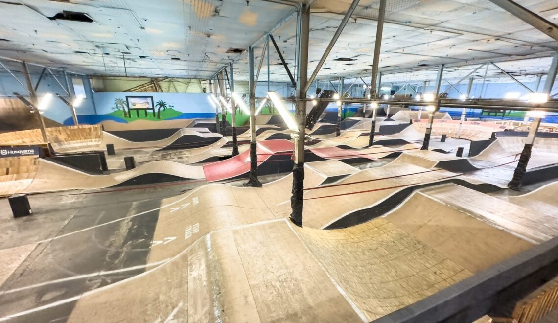 Ray’s isn’t your average indoor park. It’s a complex of interconnected rooms, hallways, and trails, making it a challenge to capture in one wide-angle photo. Anything you want to ride is here—whether it’s a skatepark, pump track, skinnies, big jumps, small jumps, or even a foam pit. The four acres of rideable terrain mean there’s always something new to discover.