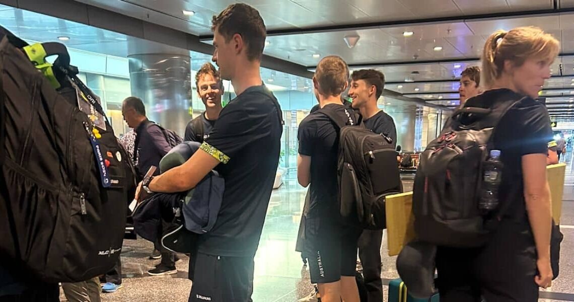 During those two hours I walked the aisle to chat with my son and realized we were sharing a flight with much of the Australian men’s team: my son Mack sat a row in front of Jay Vine, in economy (Cycling celebs — they’re just like us!), while Jai Hindley and Chris Hamilton were up in business class. No Bling Matthews to be seen.