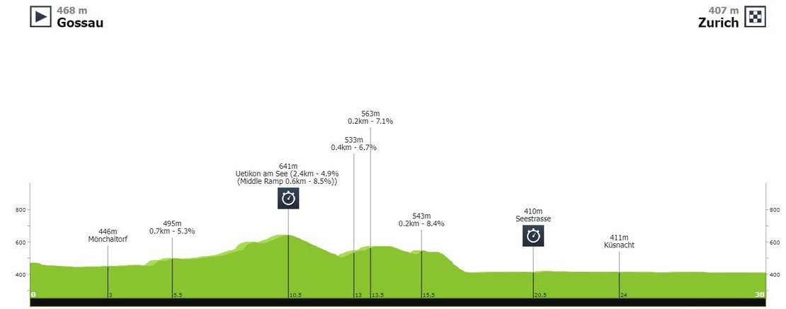 The U23 men raced the same 29.9-km time trial course as the elite women. Starting in Gossau they headed west and then south where they met the 2.5-km Uetikon a See hill before running along the east side of the Zürichsee. The intermediate time checks were at kilometers 10.4 and 20.5. There was a little bit of rain.